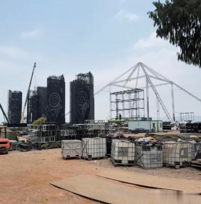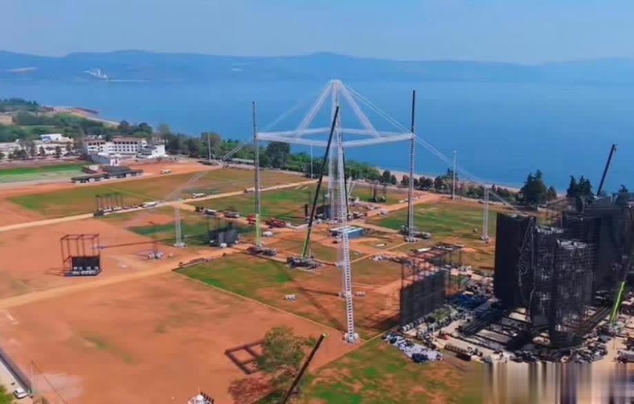 声势浩大地建起了造型独特的三角铁架,那高度恐怕在几公里开外都能望见,眼看着绿草坪都东秃一块、西秃一块了。