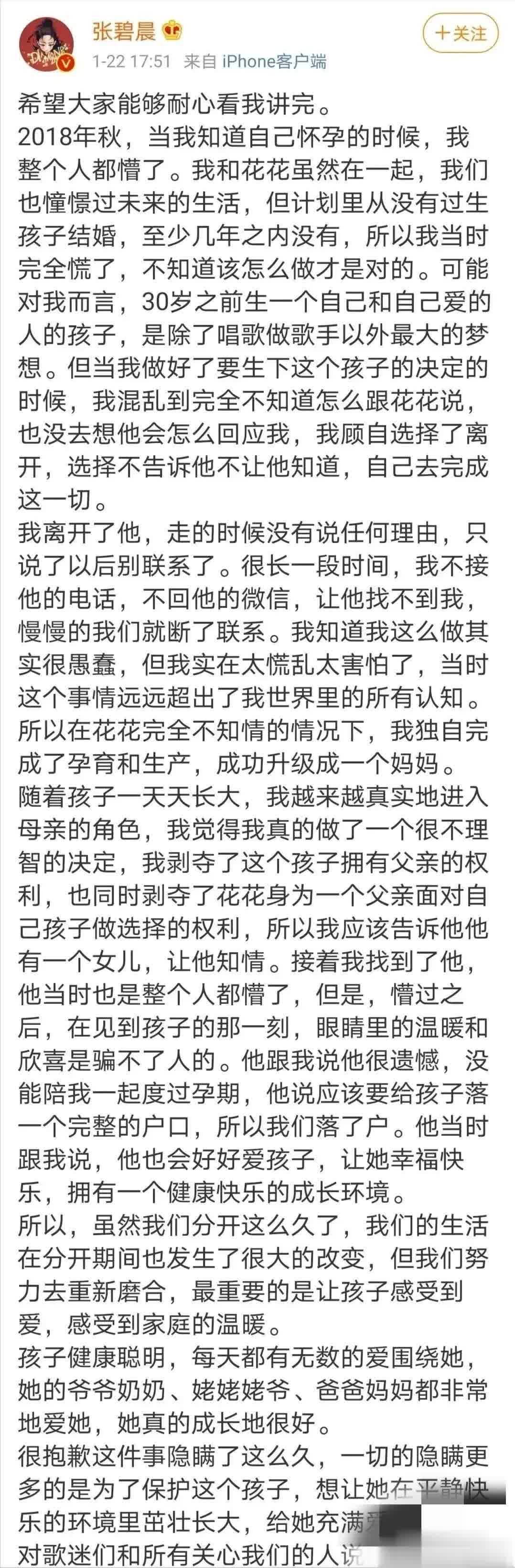 而孩子妈是同为歌手的张碧晨,张小姐在网上发文明明白白地讲清楚了来龙去脉。